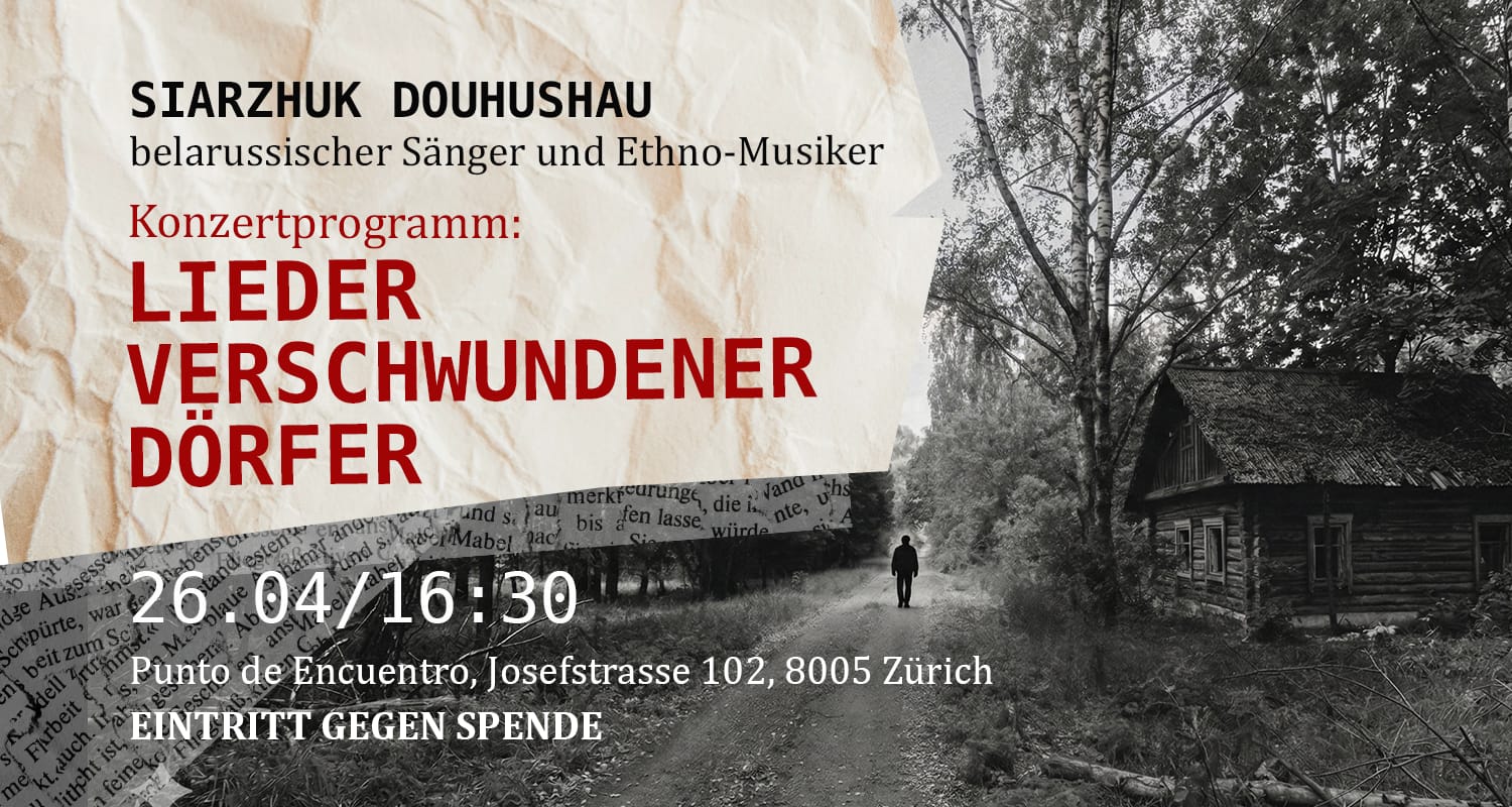 Wir laden Sie herzlich zu dem Konzertprogramm «Lieder der verschwundenen Dörfer» ein, vorgetragen von Siarhej Douhuschau, einem bekannten belarussischen Sänger und Ethnomusiker. Auf dem Programm stehen traditionelle Lieder aus den von der Tschernobyl-Katastrophe betroffenen Regionen in Belarus und der Ukraine, begleitet von der Drehleier sowie von traditionellen Blasinstrumenten.