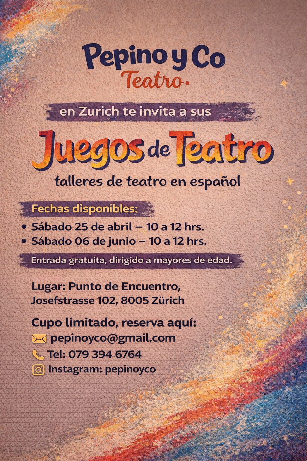 Acompáñanos en la primera edición de talleres de teatro de Pepino y Co en Zúrich. Nuestro sueño es compartir la alegría de dinámicas y juegos de teatro, y a través de ellos descubrir tus habilidades creativas, de comunicación, o simplemente pasártela muy bien.